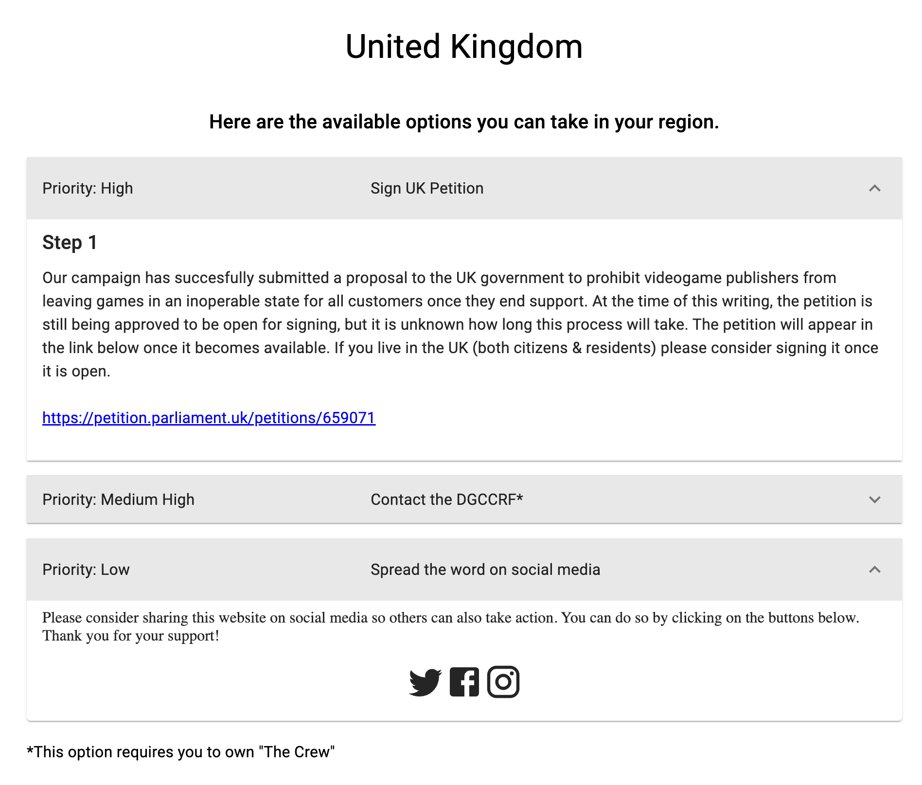 All designed to guide audiences through the process of raising their complaints - The aim is to get as much pressure and movement as possible, depending on your region, and how many The Crew owners the site can reach.