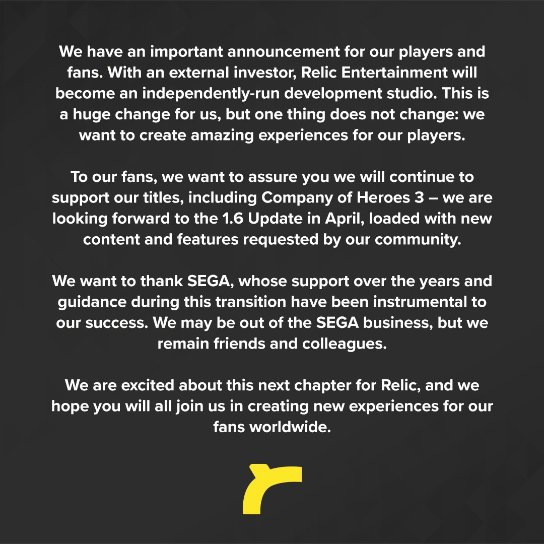- Relic Entertainment are being spun back off from SEGA.