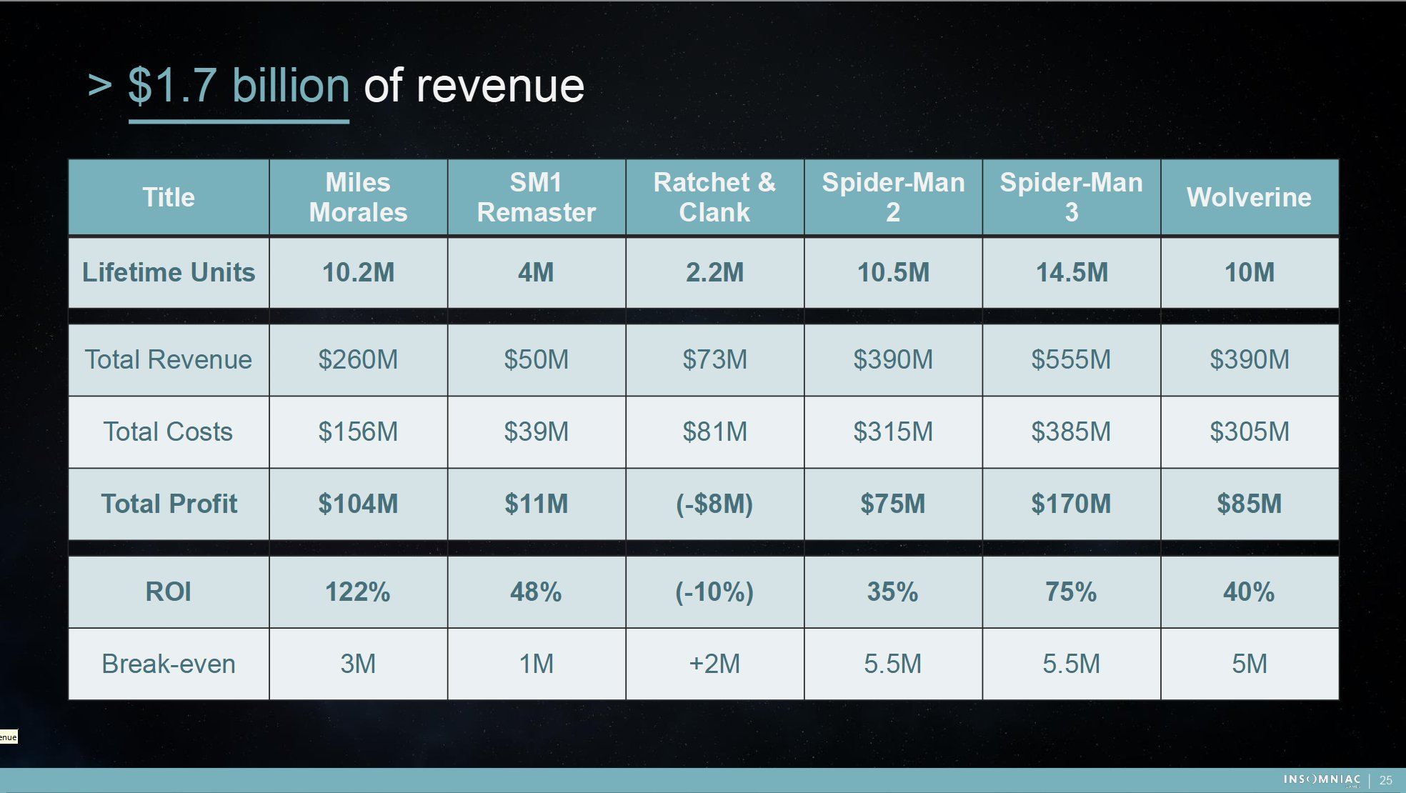 - One of the images that have gone viral is this slide seemingly showing Insomniac Games Return on investment (including projections for future titles)
