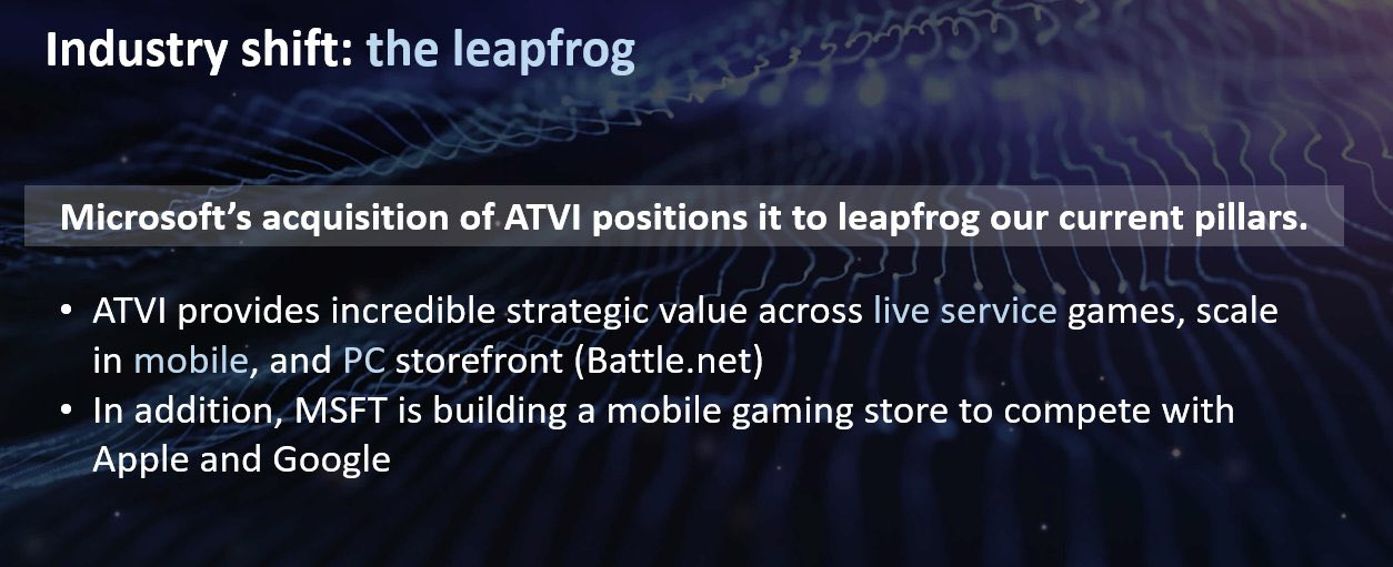 - The Leapfrog potential comes from multiple places - The acquisition of a suite of live service games, the ability for mobile scaling with King (recently made even more important with the Epic/Google ruling) and then a self sustaining PC storefront with Battle.net.
