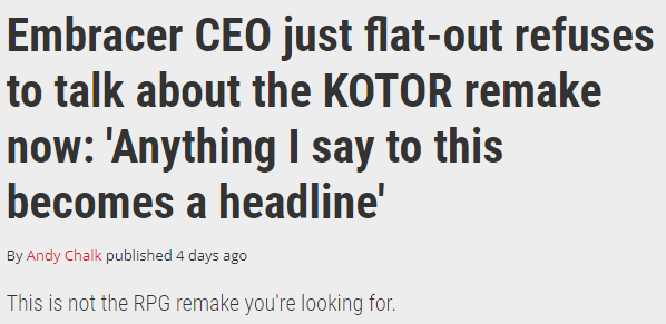 During a financial presentation, Embracer CEO Lars Wingefors remained tight-lipped when asked how he was feeling about the KOTOR remake. “I notice that anything I say to this becomes a headline, so that is my only comment,” he responded.