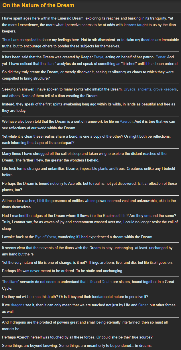 The narrative design of Dragonflight has been off the hook. The story has been great, but what I'm talking about is the ways we engage with the story. Gossip text, stay awhile and listens, quests dedicated to cultural pursuits etc. An old staple of that are lore books. But they’ve never been used in quite this way. Normally they’re ways to explore the distant past, or to put exposition you’d find in manuals or the website into a book you’d find in Ironforge’s Hall of Explorers. But now they’re expanding the lore, delving into the past in such a way that we can tell what’s coming next. DF launched with lore books talking about Earthen in Khaz’algar, 10.0.7 brought the tales of Nightsqual and the back of Azeroth. In the same way, 10.2 is bringing 3 lore books about the Emerald Dream.